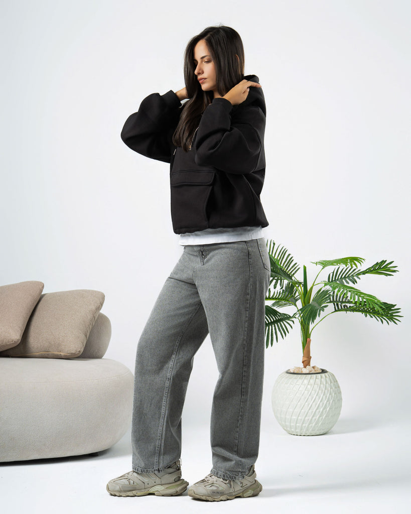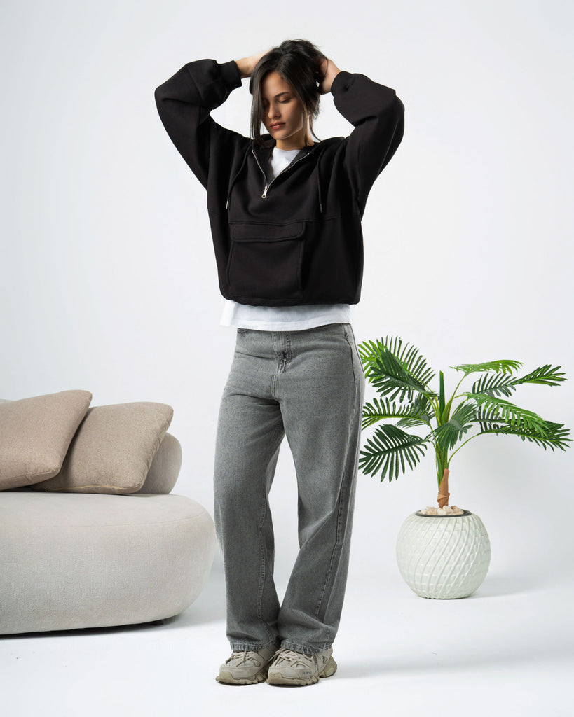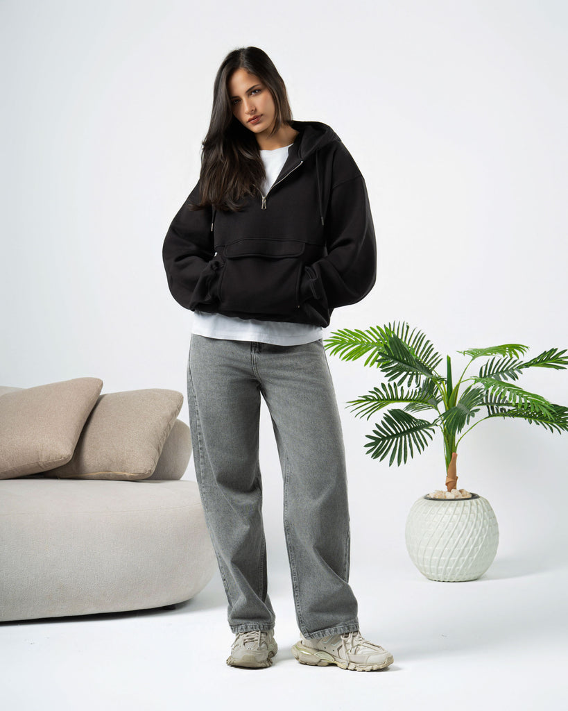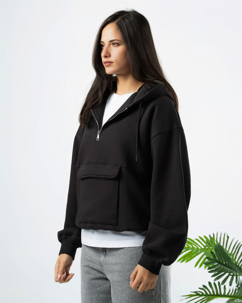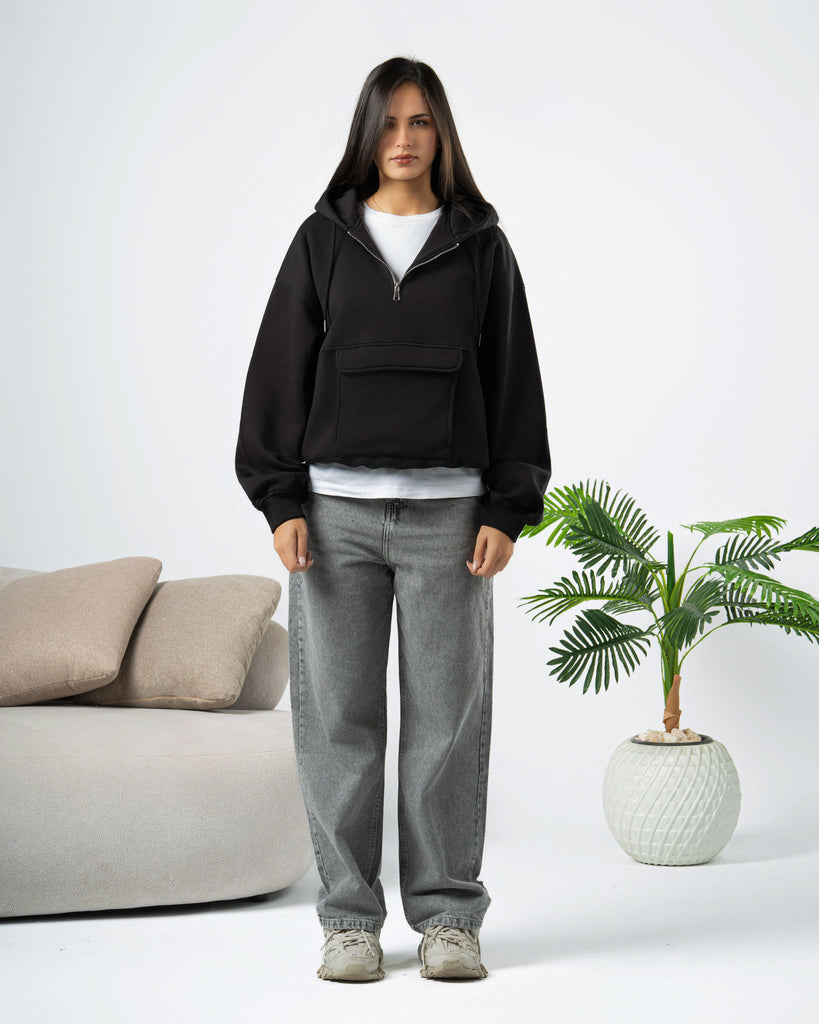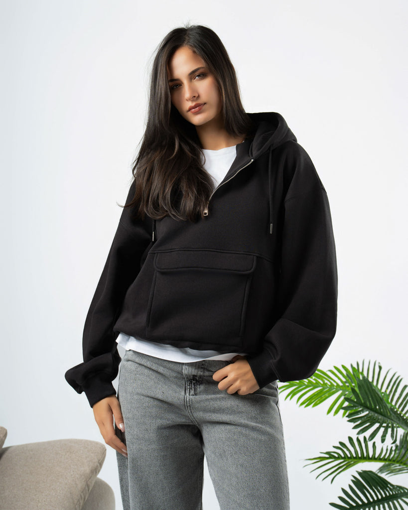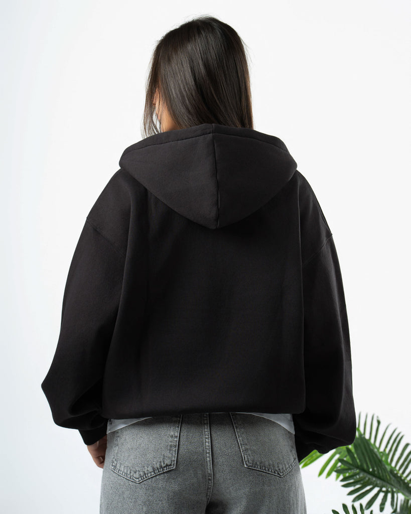 Boxi fit hoodie made of cotton fabric with a brushed fleece interior .Long sleeves and pocket on the front . Ribbed trims.