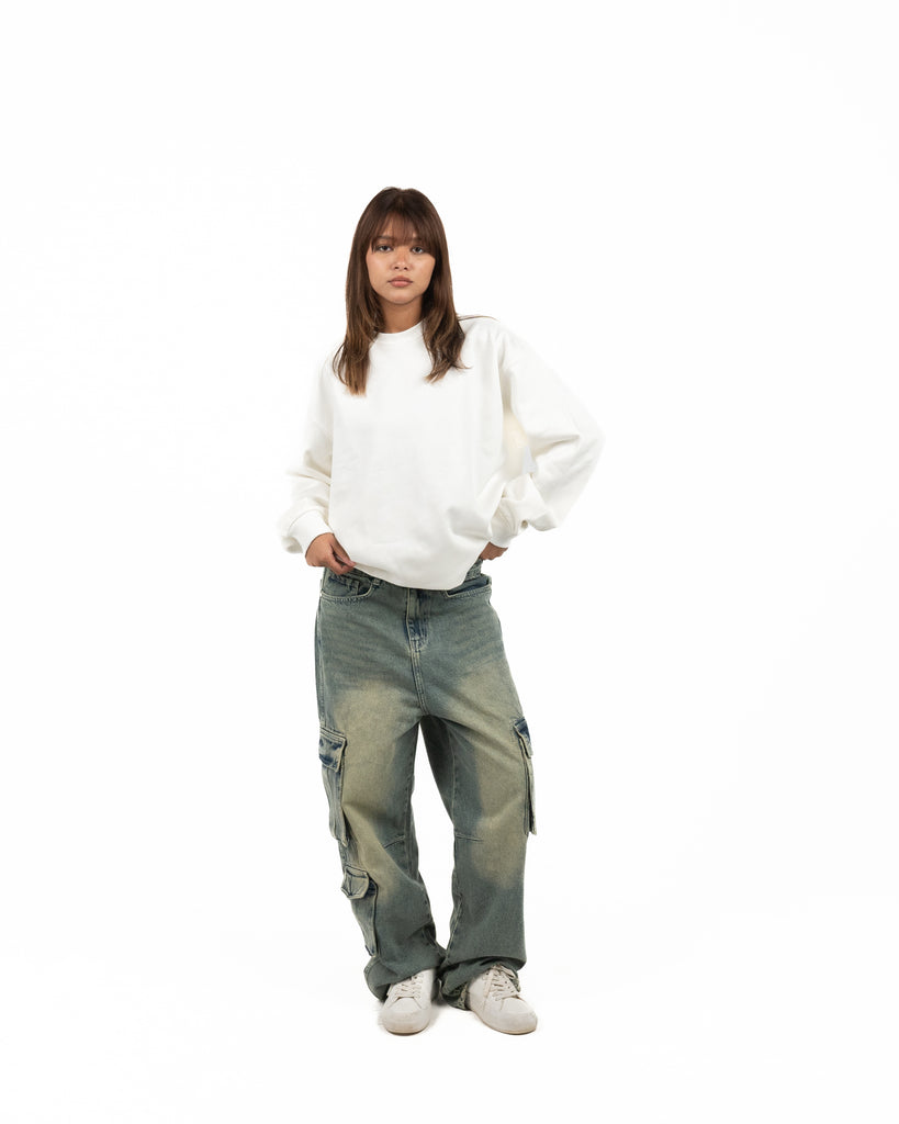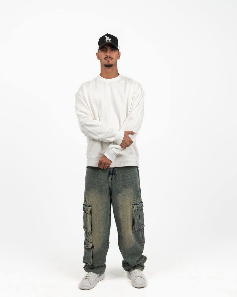 Baggy fit trousers made from cotton denim. Featuring front pockets, patch back pockets and leg pockets with flaps. Washed effect. Zip fly and top button fastening.