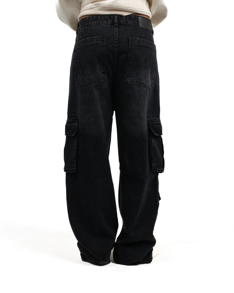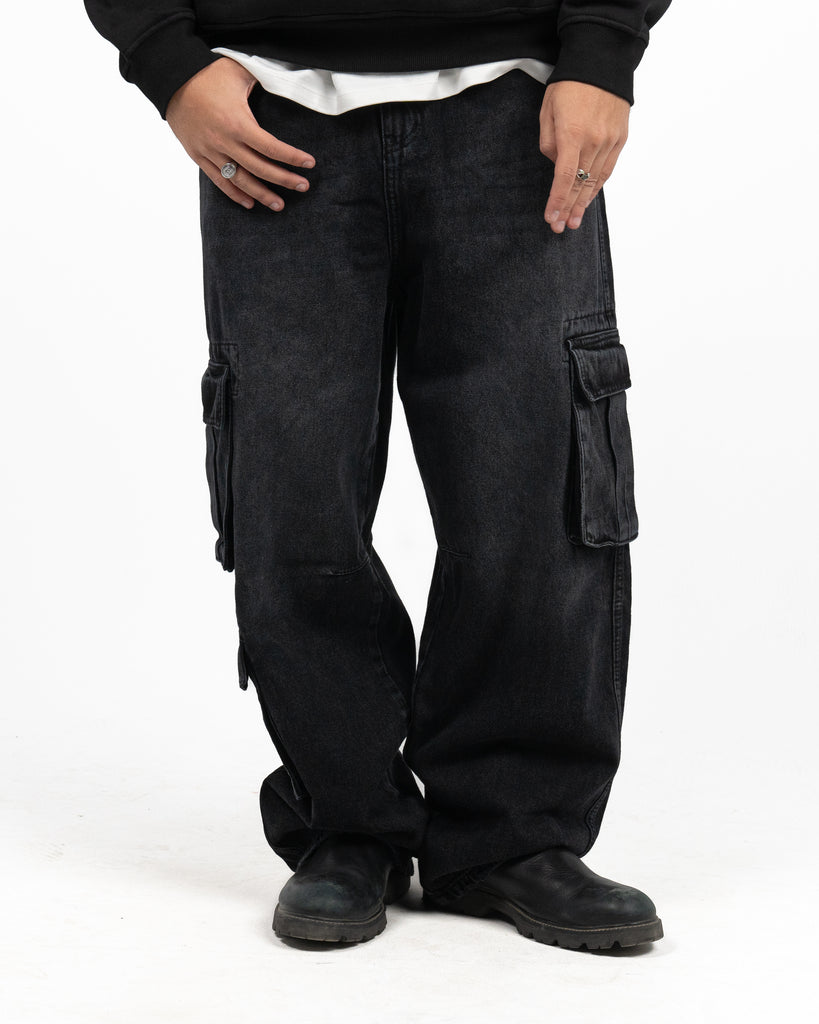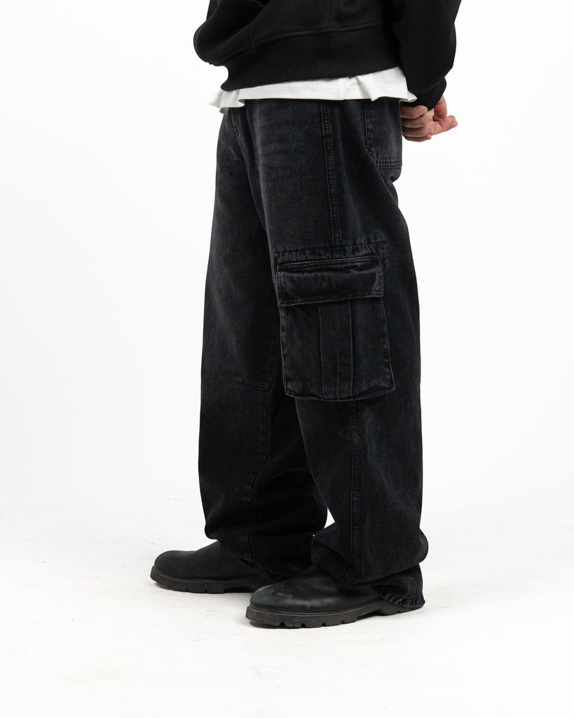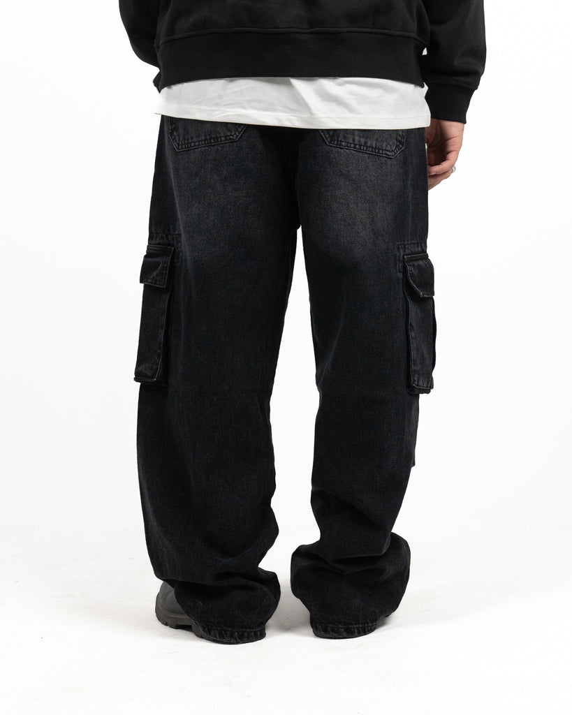 Baggy fit trousers made from cotton denim. Featuring front pockets, patch back pockets and leg pockets with flaps. Washed effect. Zip fly and top button fastening.