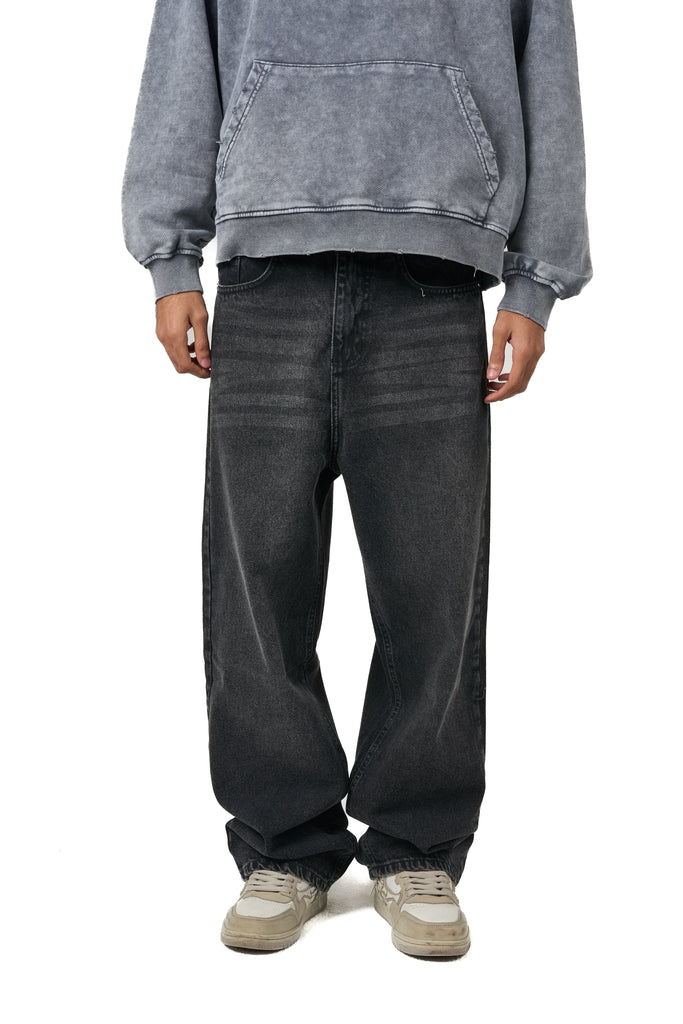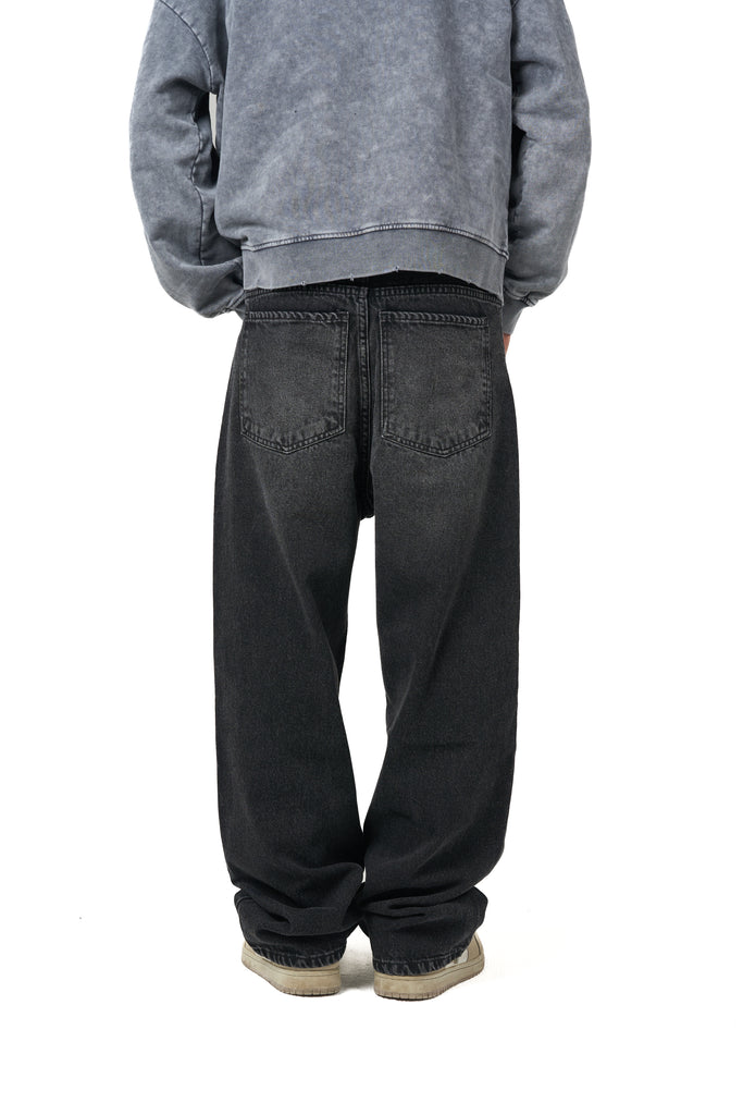 Baggy fit trousers made from cotton denim. Featuring front pockets, patch back pockets. Washed effect. Zip fly and top button fastening.