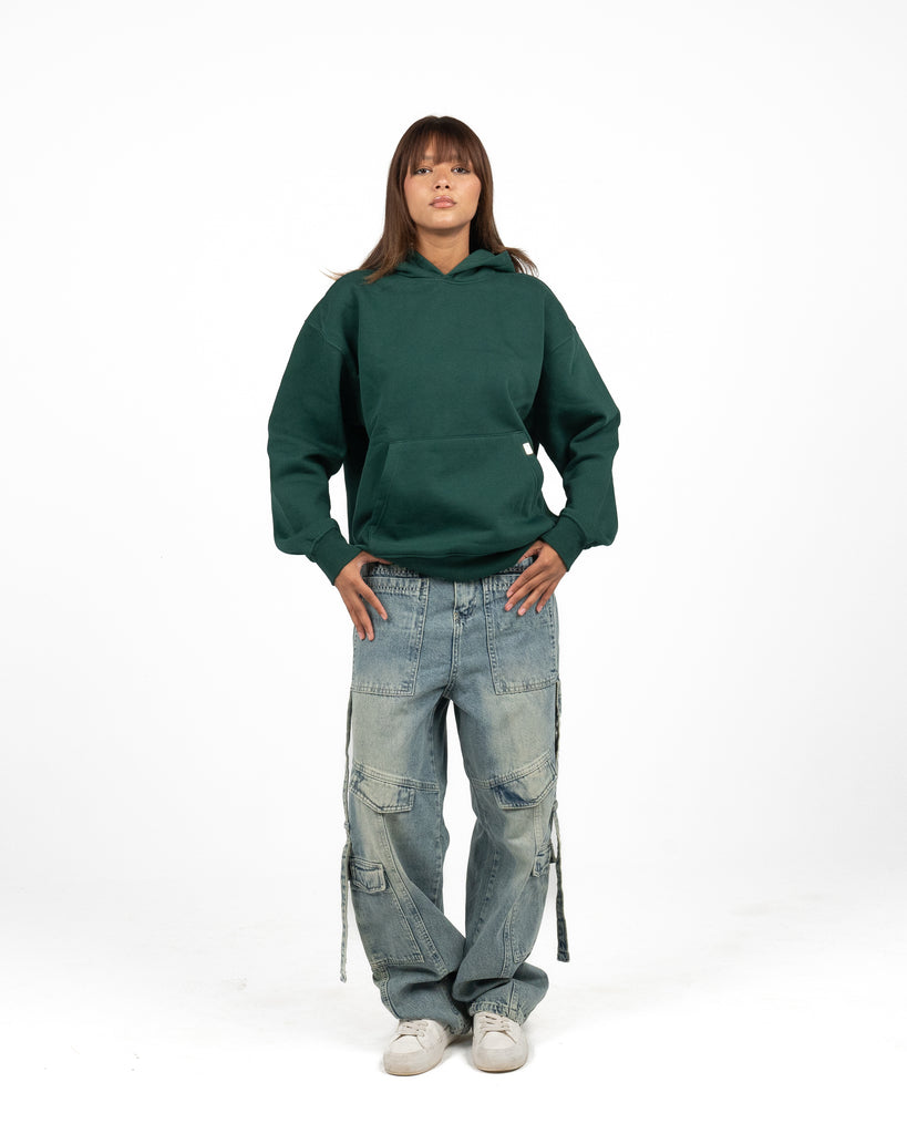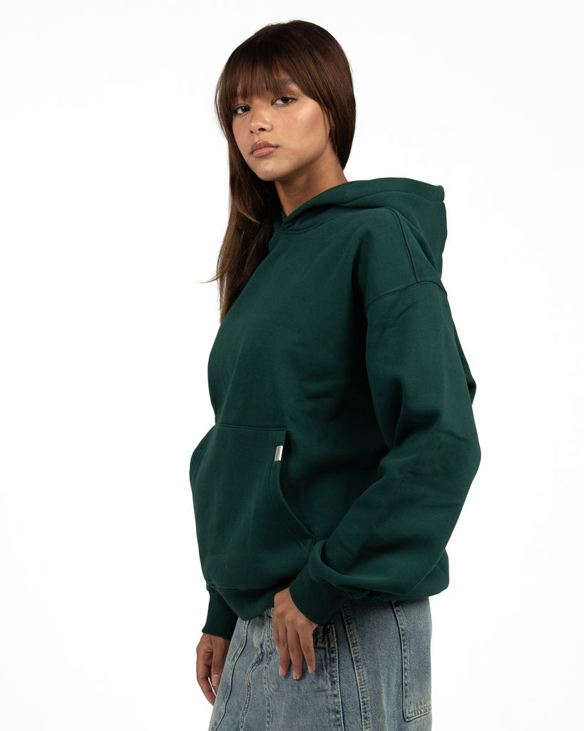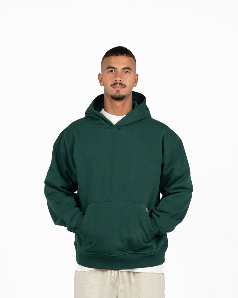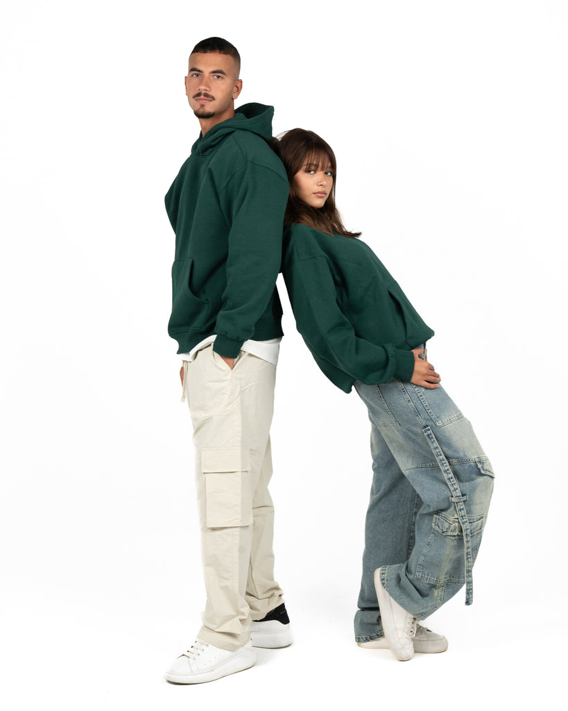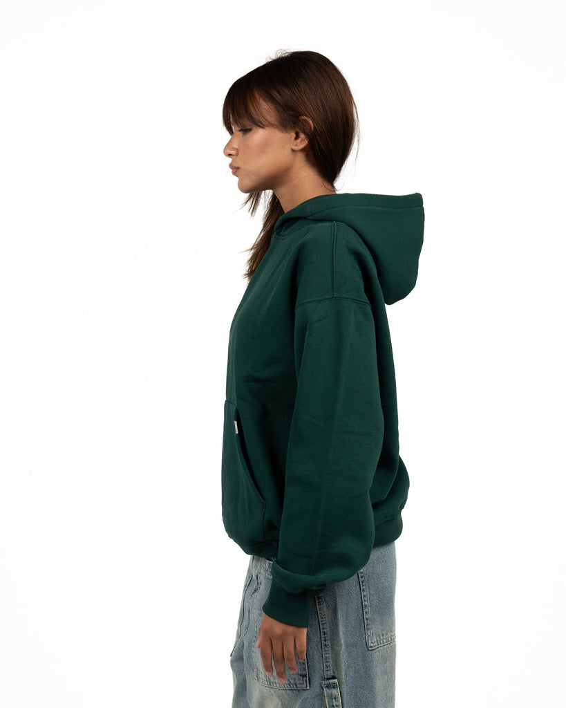 Oversized fit hoodie made of cotton fabric with a brushed fleece interior. Long sleeves and ribbed trims. Front Kangaroo pocket and ribbed trims.