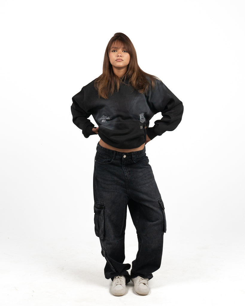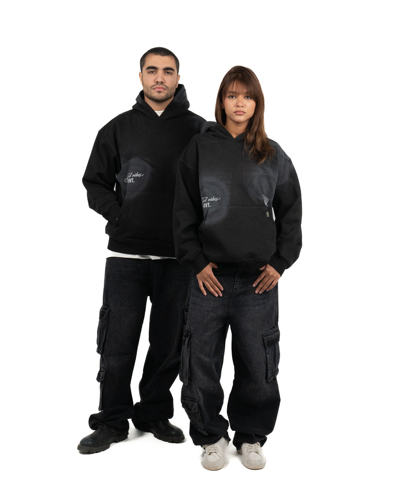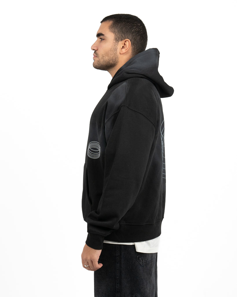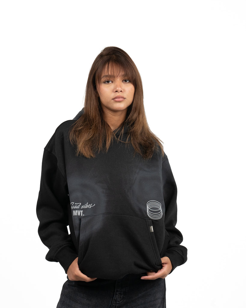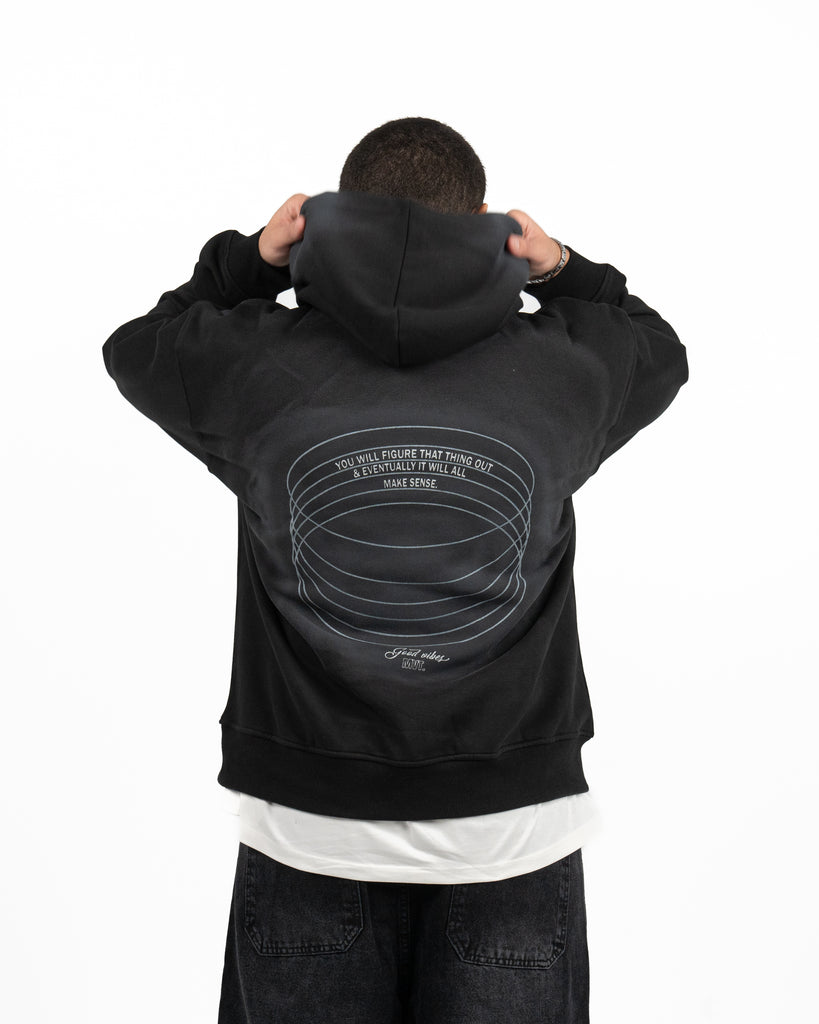 Oversized fit hoodie made of cotton fabric with a brushed fleece interior. Long sleeves and contrast prints on the front and back. Ribbed trims.