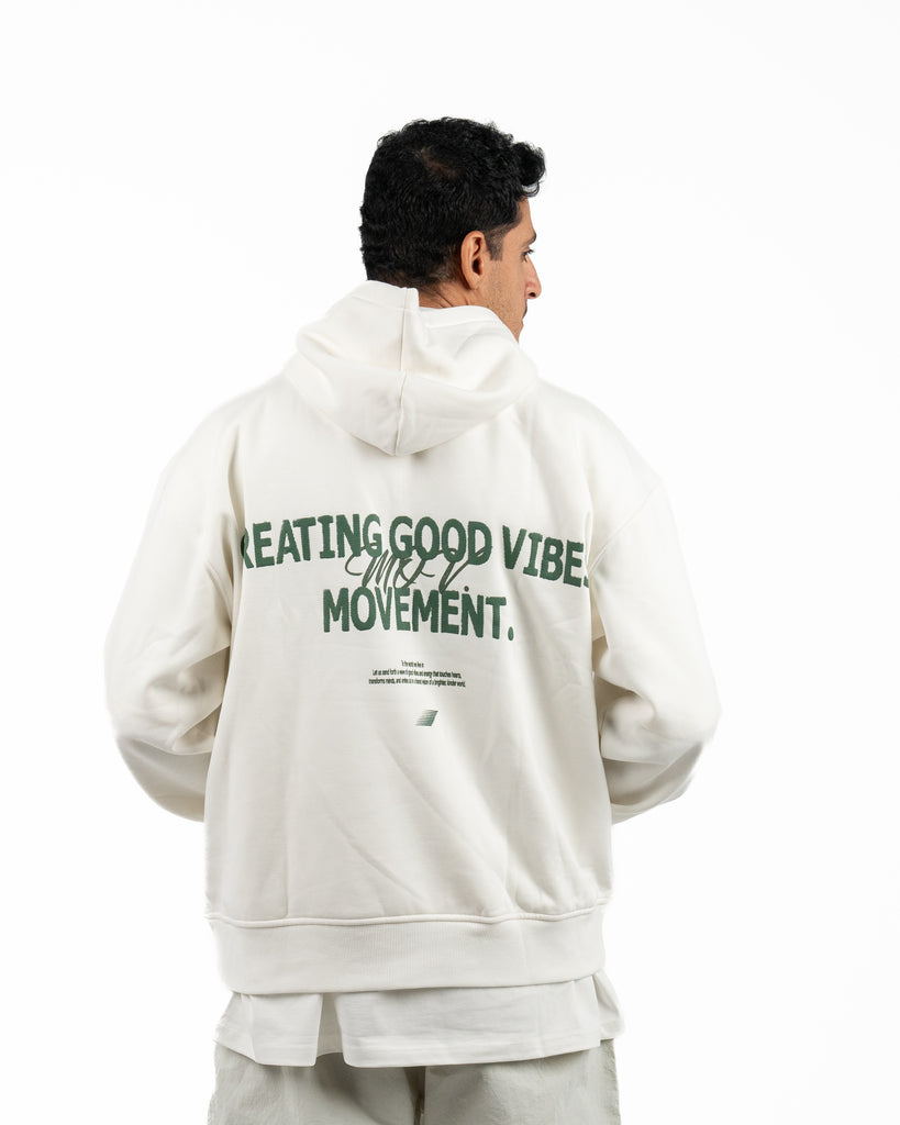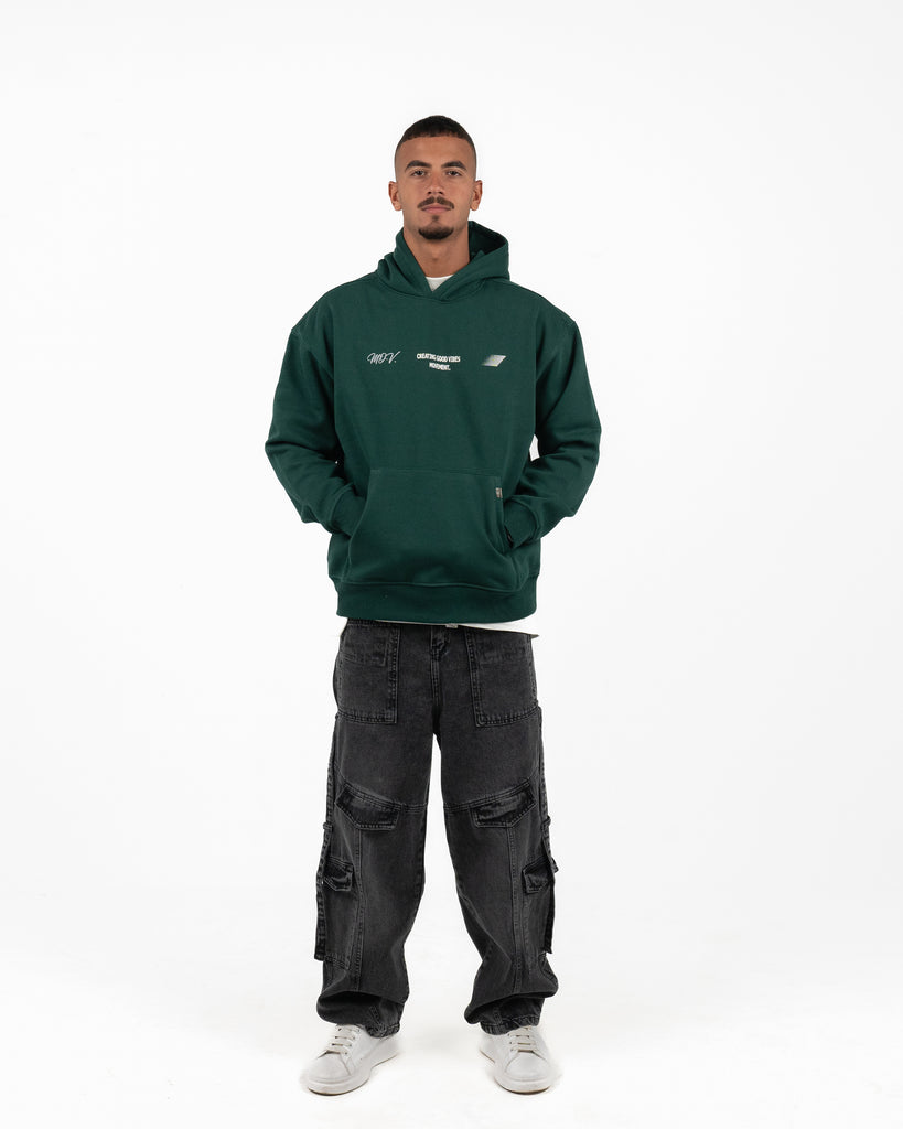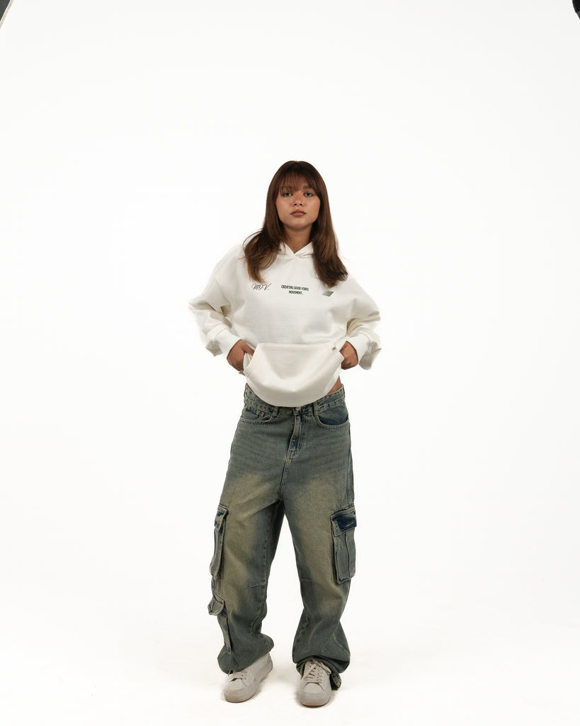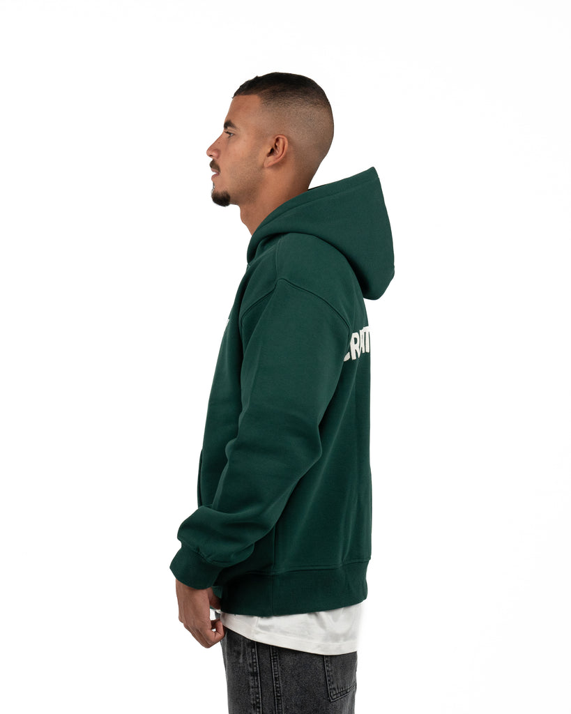 Oversized fit hoodie made of cotton fabric with a brushed fleece interior. Long sleeves and contrast prints on the front and back. Ribbed trims.