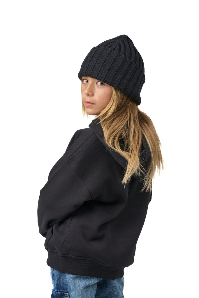 Oversized fit hoodie made of cotton fabric with a brushed fleece interior. Long sleeves and contrast prints on the front . Ribbed trims.