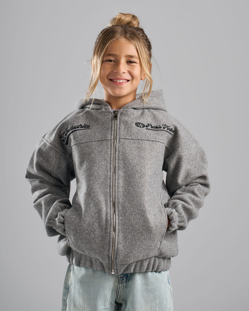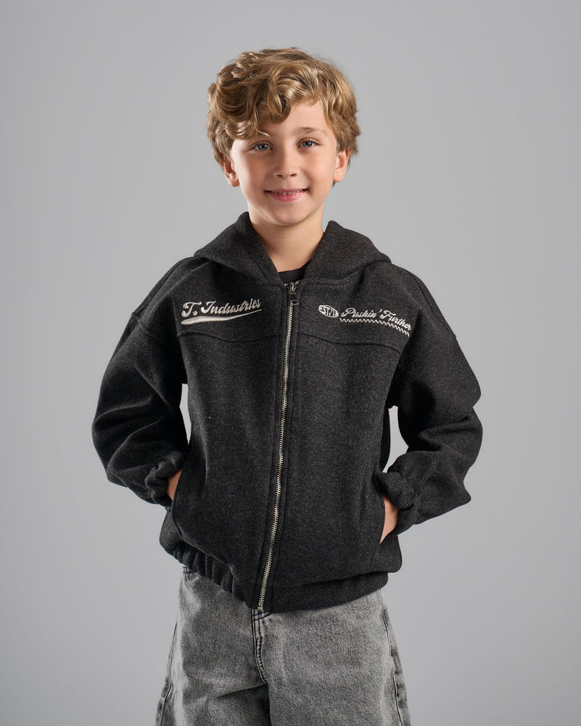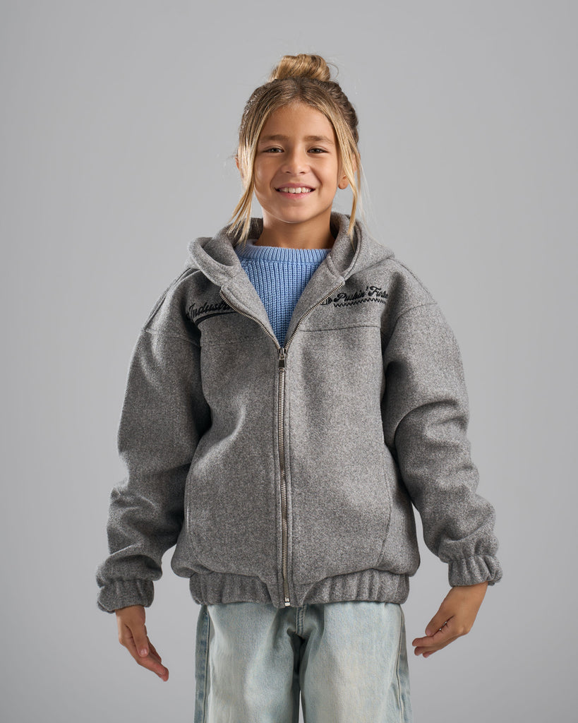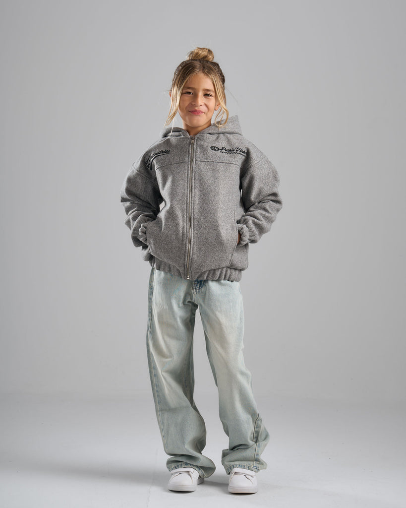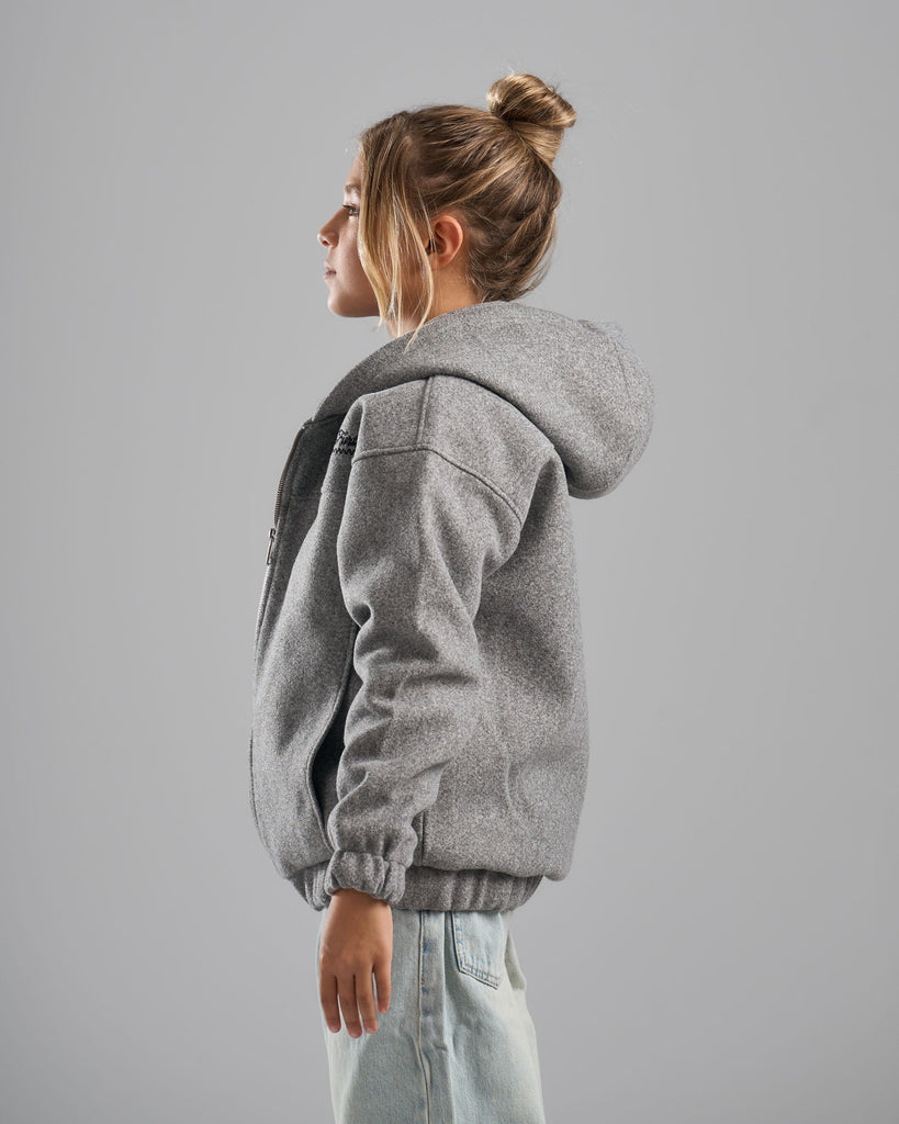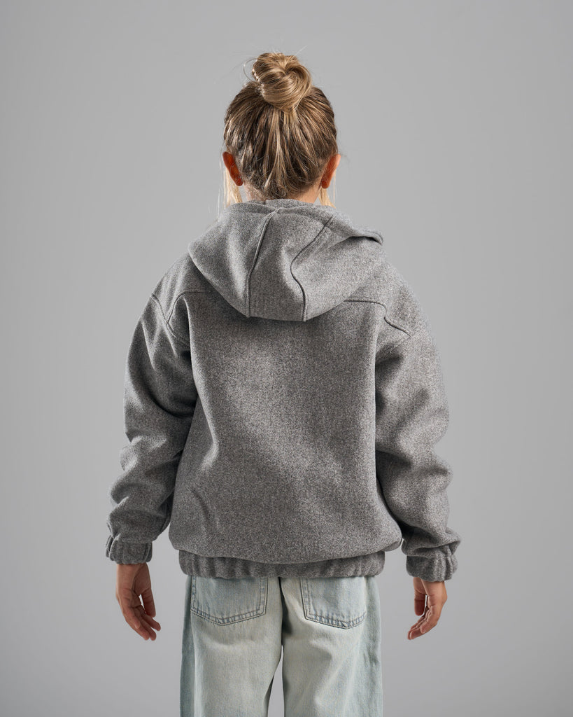Wool Kids Jacket with Hoodie and embroidery on the front.