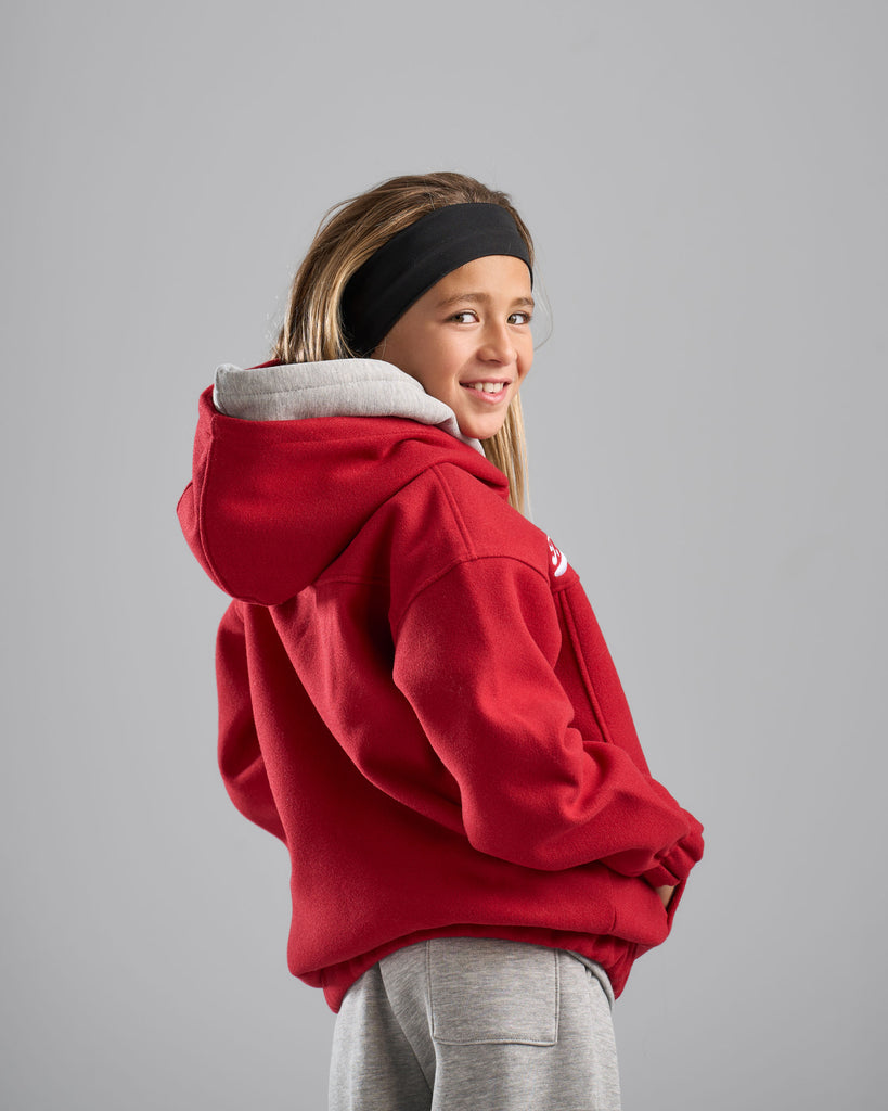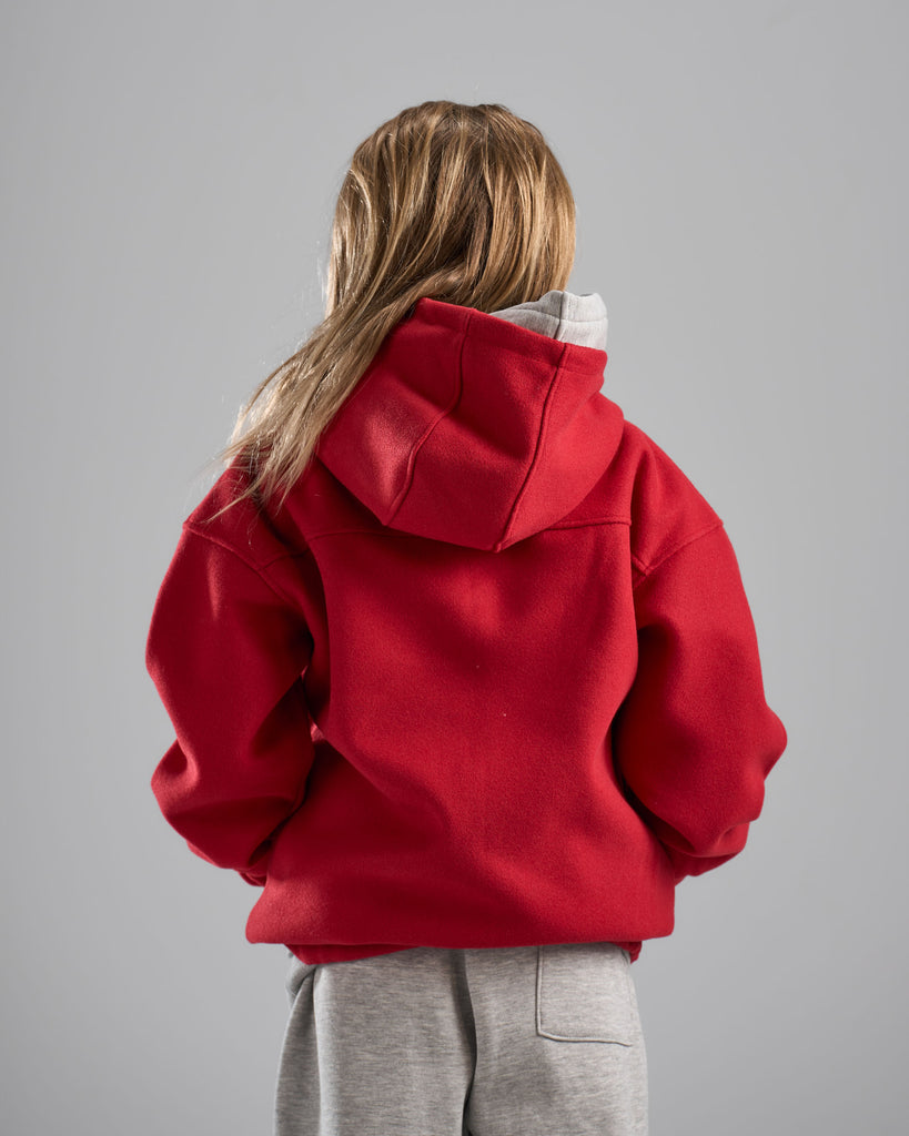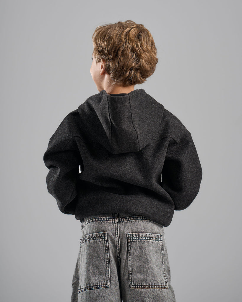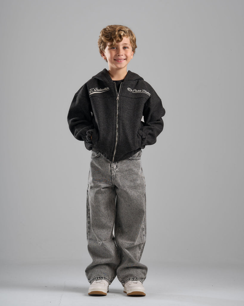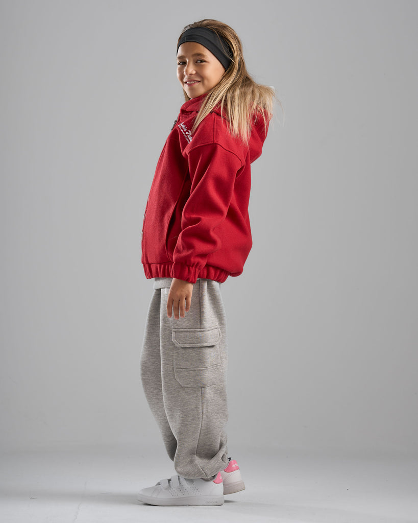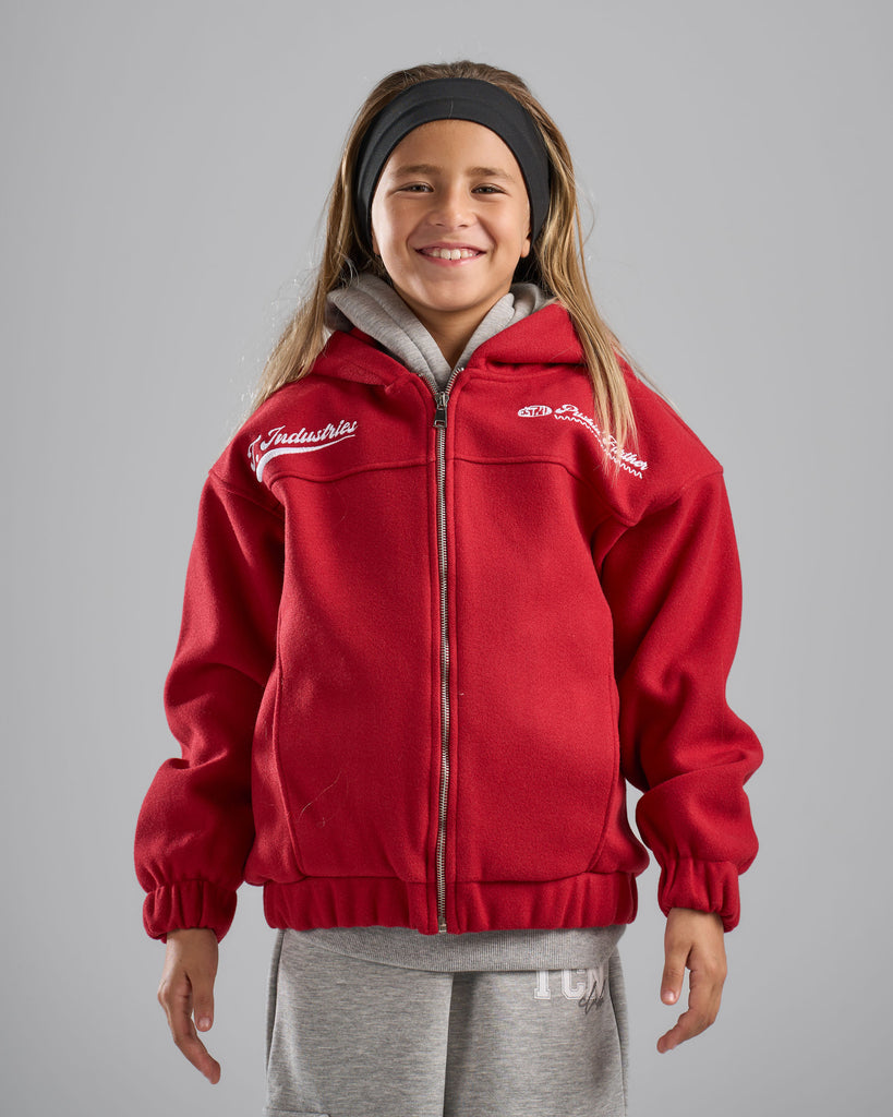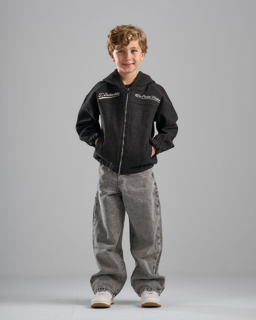 Wool Kids Jacket with Hoodie and embroidery on the front.
